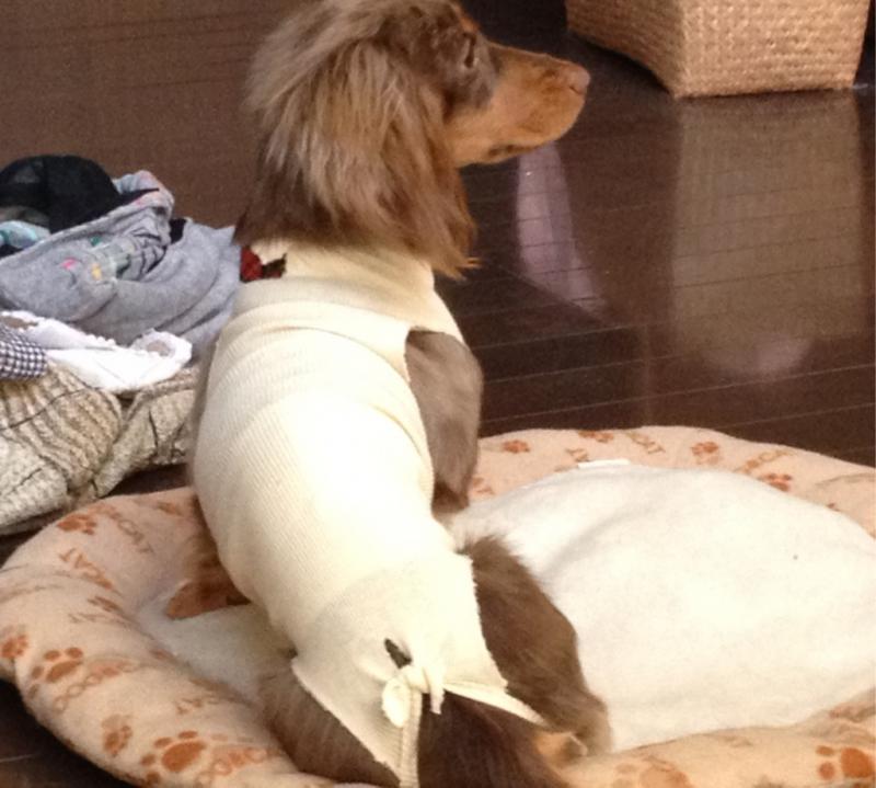 傷口に負担のない様に動物病院オリジナルのサポーターを着ています。