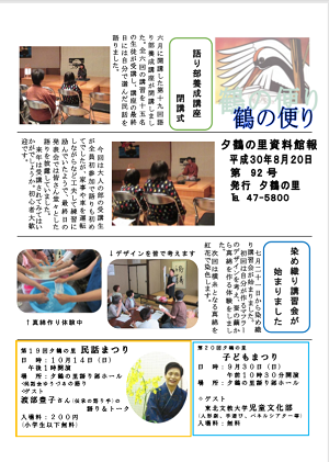 今年も夕鶴の里「民話まつり」を開催します。 今年は民話会ゆうづる3名の語りと 新庄市にお住いの伝承の語り手渡部豊子さんの 語り&トークがあります。 渡部さんは山形県だけではなくインドのネルー大学 で伝承の昔話を披露するなど幅広くご活躍されています。 是非、お越しいただければと思います。 第19回 夕鶴の里「民話まつり」 ●日 時:平成30年10月14日(日)13:00〜 ●場 所:夕鶴の里 語り部ホール ●内 容:民話会ゆうづるの語り ゲスト・渡部豊子さんの語り&トーク ●入 場 料:200円(小学生以下無料) ●チケット取扱:夕鶴の里、南陽市各地区公民館 ●申込・お問合せ:夕鶴の里 0238−47−5800 |