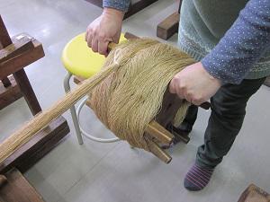青苧の繊維は短いので、糊とよじりでくっつけて1本の長い糸にします。