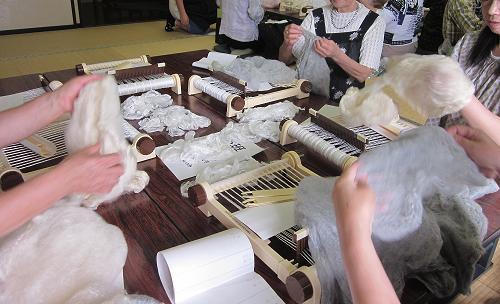 この日は、前回染めた真綿、真っ白なままの真綿を紡ぎ、