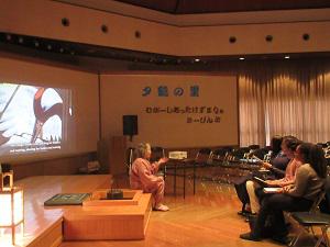英語字幕の映像を観ながら語り部さんの民話語りを聞いた後、機織り体験と資料館を見学されて行きました。