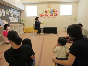 とお孫さんたちを前に、手遊びや昔話、紙芝居、絵本などでを見せて、