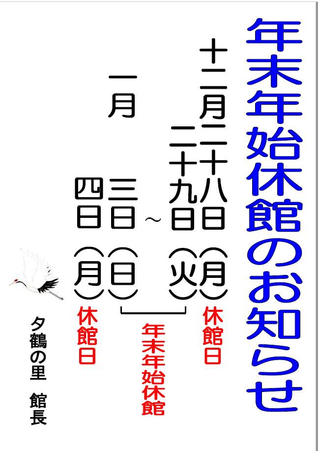 夕鶴の里の年末年始休館は、下記の通りとなります。
