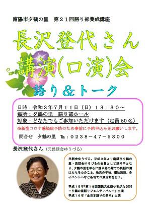 長沢登代さんの民話講演(口演)会が7月11日(日)に開催されます。