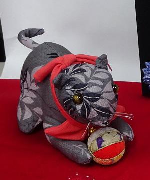 『續 裁縫おさいくもの』に掲載されている猫の玩具を参考に製作していただいたちりめん細工です。本には猫に前掛けを付け毬を持つよう指示がありました。