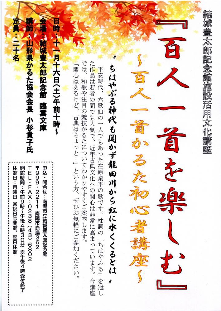 施設活用文化講座の第6回(最終講座)が来る11月19日に開講する。あまりなじみのないカルタ取りであるが、もしかすると一度はしてみたいと思っている方がいるのではないかと、山形県かるた協会会長 小杉貴子氏による指導で開催する。多数の参加をお待ちしています。