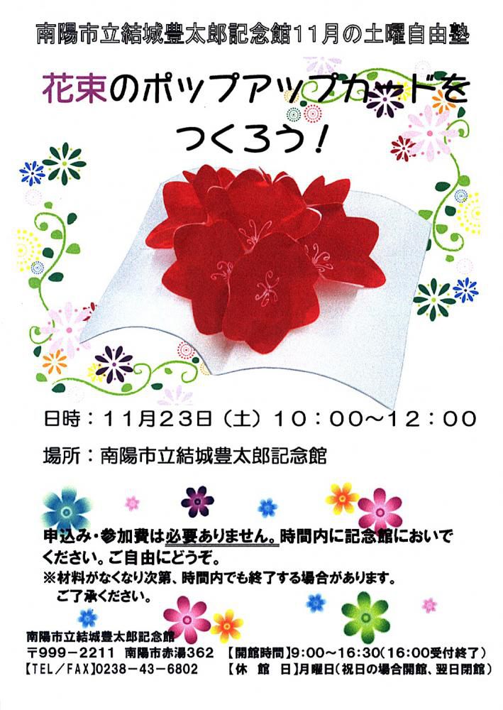 11月の土曜自由塾は、開くとかわいい花が飛び出す「ポップアートカード」づくり。お母さんと一緒につくってみませんか。