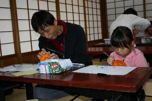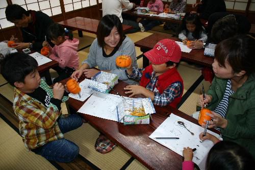結城豊太郎記念館の10月の土曜自由塾はハロウィンにちなんで「本物のかぼちゃでランタンづくり」を行った。定員いっぱいの20名の子供とお父さんお母さんが参加。さっそくかぼちゃをくりぬき、顔のデザインを考え、ランタンづくりを開始。
