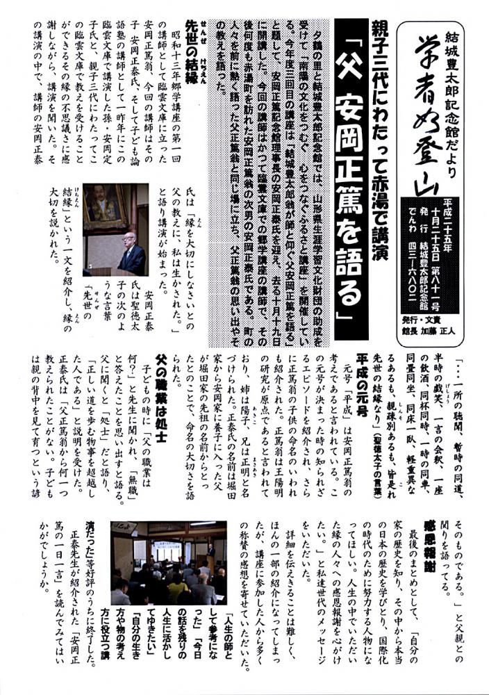 去る10月26日に、ふるさと講座の第5回講座を開催した。このたびの講師は、結城先生と忘年の交わりがあった安岡正篤翁の次男・安岡正泰氏である。