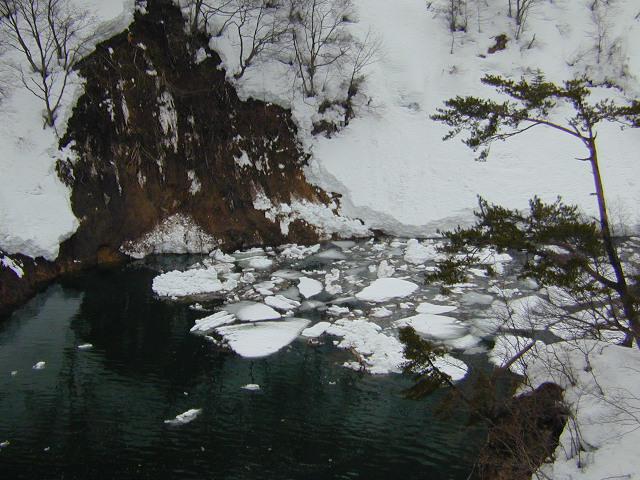 この様に暖かくなると山の斜面に張り付いていた雪がドサッと雪崩のごとく白川湖に注がれます。まるで流氷。春がそこまで来ています。