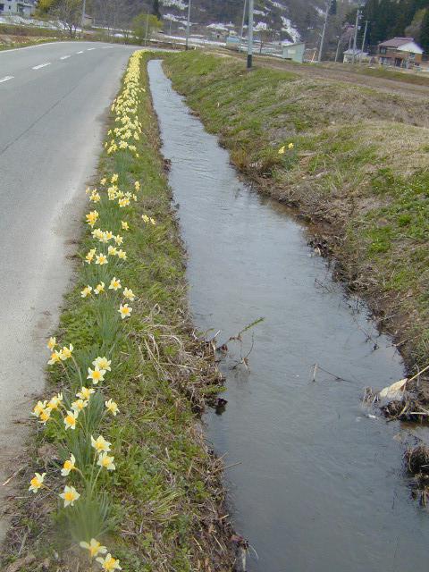 お見事の一言!地域の方々が力を合わせて植えた水仙が毎年道路脇に一斉に咲き誇ります。その距離は数キロにも!春にみごとな彩りを添えてくれます。