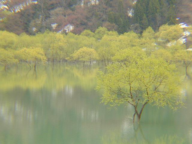 飯豊町中津川白川湖岸公園春の風景。こんな林の中カヌーで行ったらいいだろうなー。