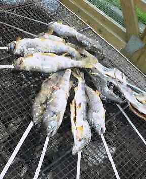 飯豊山の麓、清流にはぐくまれた自慢のやまめです。こうやって炭火でじっくりと焼き上げます。香ばしい香りが食欲をそそります。これは白川荘の下の広場でちびっこたちが魚のつかみどりをしたものをやいたものでーす