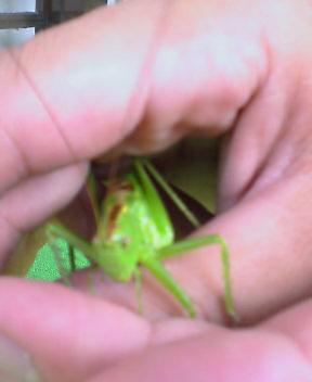 あざやかな黄緑色のバッタくん、暴れん坊でちっともジッとしててくれないの(;^_^A。手足のギザギザが痛いから、おとなしくしていてね。