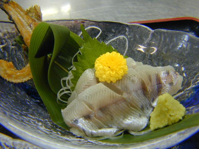 ホテル フォレストいいでのお膳の一品、やまめのお刺身。骨も無駄なくから揚げに。これが美味いんだな〜。