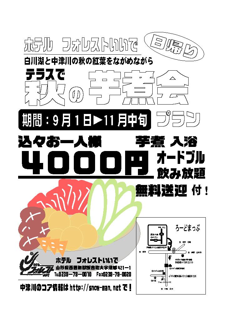 毎年この時期やってきます。今年はホテル フォレストいいでのプランはいかがですか?ただ宴会場じゃつまらない!景色もメニューの一つ!そんな要望に答えました。フォレストからの秋の眺めは絶景!幹事さんのカブも急上昇ー!お一人様込々4000円(オードブル+芋煮鍋+飲み放題+入浴付き)無料送迎あり