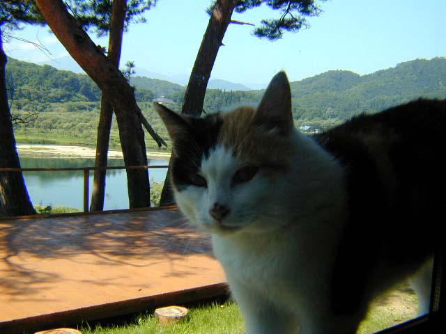 先月辺りから猫が増えてしまいました。今日の中津川の天気は快晴!暑くもなくここちよい風が吹いてます。こんな感じでお客様の朝食時ガラス越しに近寄ってきます。なかなかの美人さんです。