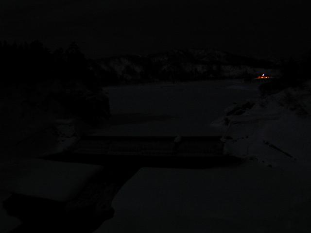 大雪も一段落?冬の月夜もなかなかです。奥の白い平原は白川湖。奥の明かりは白川荘。ちょっとCGの世界みたい。
