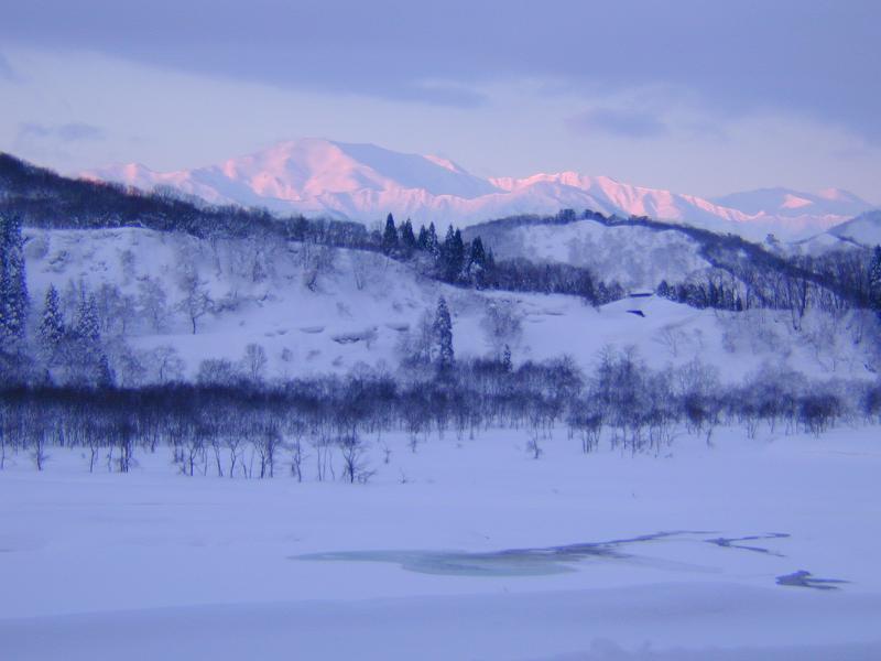 2月はこんな瞬間にめぐり合える!天気の良い朝方、飯豊山は朝焼けに染まります。それはほんの数十分の出来事。本当に美しいのだ。