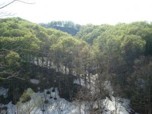 早朝の撮影なので淡い色になりましたが、ブナの緑とのコントラストが感動的です。来年の連休はこの山桜の鑑賞にぜひおいでください。