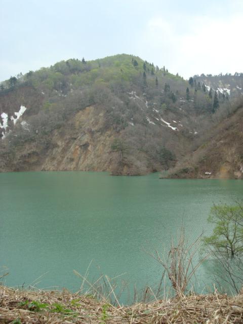 湯の沢間欠泉下流白川ダムを取り囲む山々も春の息吹が感じられます。