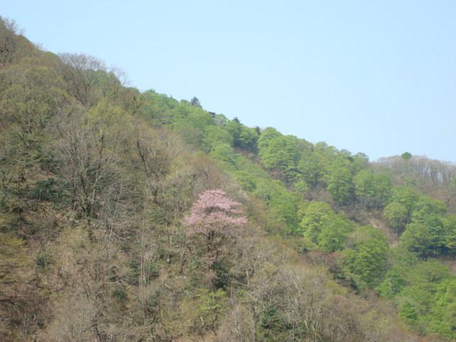 桜の奥の黄緑は「ブナ」の原生林です。