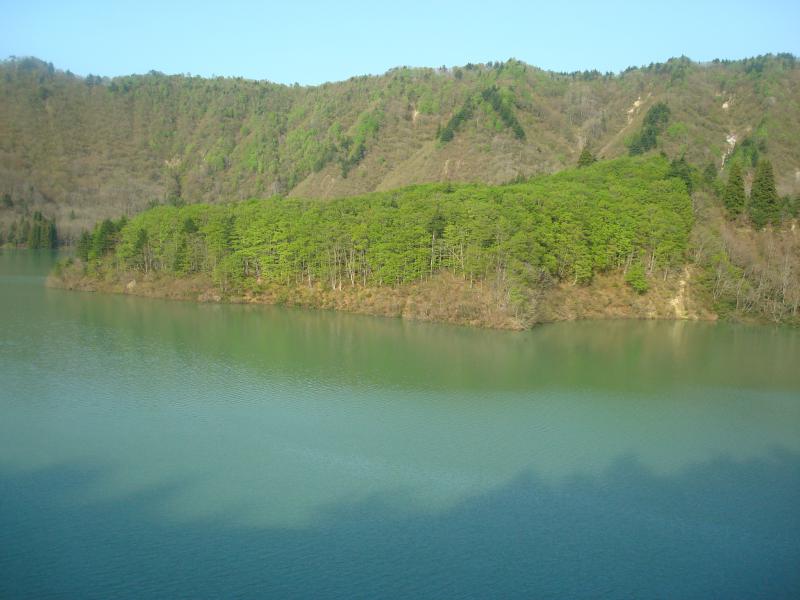 白川ダムサイトより上流1Km湖面に映えるぶな二次林です。