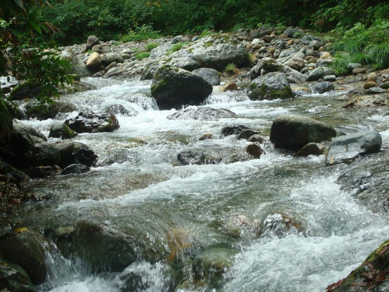 湯の華間欠泉のある飯豊連峰は時々降雨があり、間欠泉までの清流は例年に無く水量豊富です。