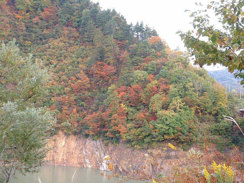 間欠泉の途中白川ダムの紅葉です。