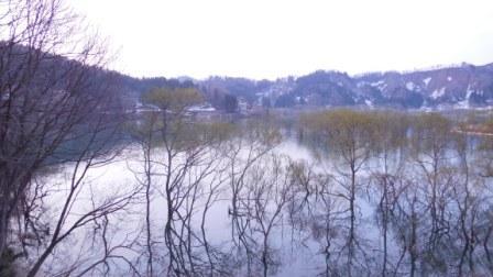 雪解けが進むと白川ダムは、満々と濃いグリーンの雪解け水で満たされ、湖畔公園の柳があたかも水面に浮いているような光景が望めます。(5月中のみ)