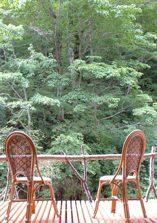 温泉に浸かって火照った身体を、このベランダでブナの原生林から吹き降ろす涼風で汗を沈める、至福の一時を是非堪能してください。