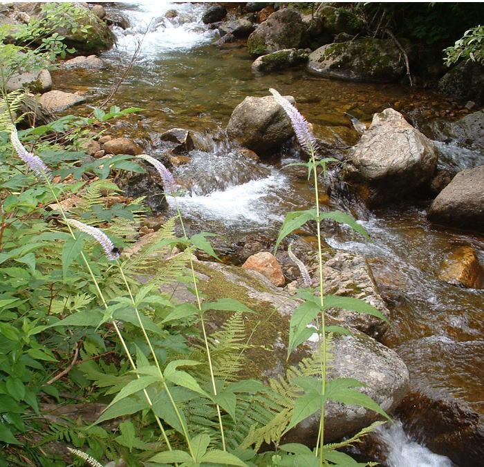 ▼広河原間欠泉湯の華のせせらぎに咲いた「くがいそう」