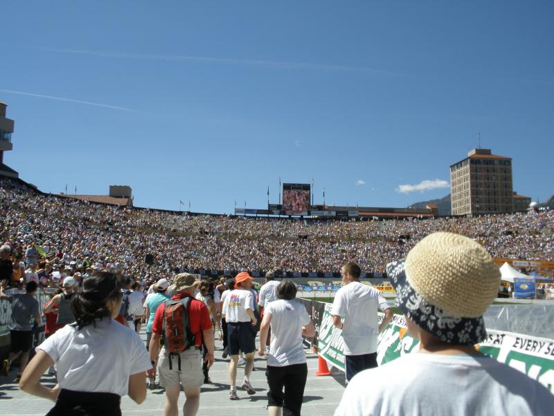 写真はゴールとなっているコロラド大学のスタジアムです。どうです、これだけの観客に迎え入れられると感激しますよね(先にゴールした人ももちろん入ってますが)。