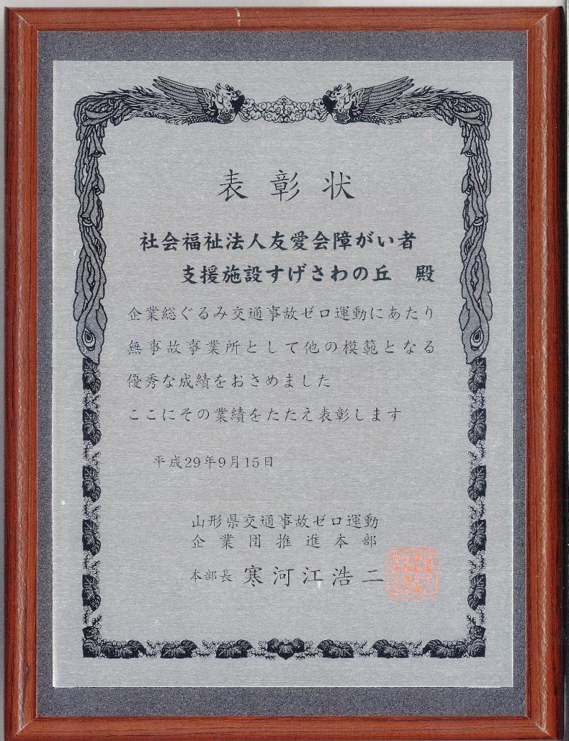この度、山形県交通事故ゼロ運動企業団体推進本部主催の企業総ぐるみ交通事故ゼロ運動・第49回推進大会において、山形県安全運転管理者協会の推薦により、“障がい者支援施設すげさわの丘”が、「優良模範事業所」として表彰を受けました。今後も、職員が一丸となり、交通事故ゼロ運動を推進して参ります。