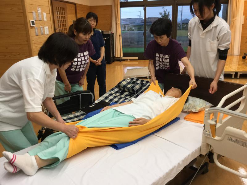 主に4月入職者を対象とした『採用6ヶ月研修』を行いました。約半年たった今だからこそ習得すべき知識と技術を、実技メインに行ったこの研修は「目からうろこです!」「すごく勉強になりました!」と、絶賛された研修となりました。研修では、理学療法士による「移動・移乗」を人体構造や機能を理解した上での知識を、ベテラン介護職員からは、様々な介護グッズを用いた介助方法から介護者自身の体に合った介助技術まで幅広く教えてもらいました。また、実際に誤った方法で介助された利用者の体験もしてみて「怖い・・・苦しい・・・」など、相手の気持ちも考えて介助する大切さも学びました。どうすれば双方に負担なくできるのか?そして利用者のもつ「できる機能を活かす」介助の方法とは?等、身を持って知る機会となり、これまで以上にやる気が出たみたいです。今後もともにがんばっていきましょう!
