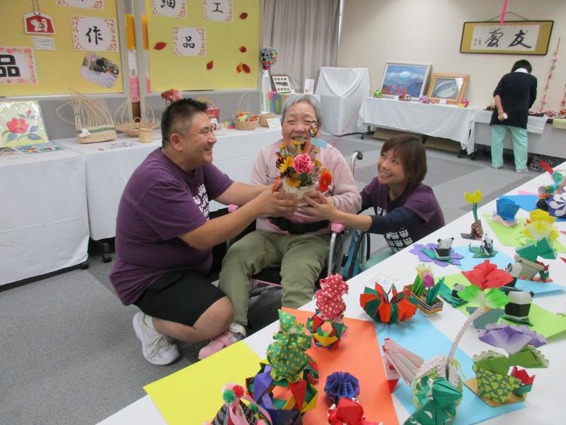会議室では、利用者の皆様方をはじめ地域の皆様方や職員などの作品を展示し、多数の方々にご来場いただき作品を楽しんでいただきました。職員と一緒に見てまわった利用者からは「みんな上手にできてるね〜、すごいね〜」などの感想が聞かれ、あれこれと会話をしながら楽しんでいただけました。
