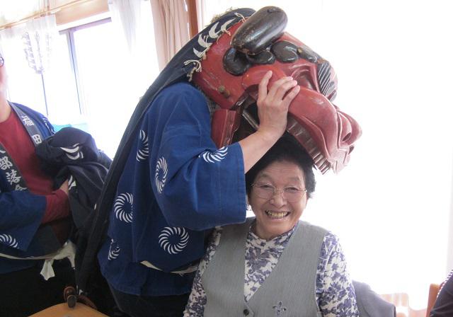 黒沢地区で毎年恒例の福田神社のお祭りがあり、デイサービスくろさわにも獅子舞が来てくれました。獅子は歯をカチカチ鳴らしながら飛んだりはねたりといろんな動きを見せ、ご利用者様は今年一年、無病息災で過ごせるよう獅子に頭を噛んでもらい大変喜んでおられました。