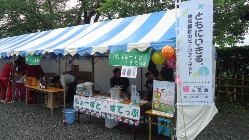 6月8日(土)上山城周辺にて開催された「やまがたワインバル」に今年もふぁーすと・すてっぷが参加しました。当日は朝から雨降りのあいにくのお天気にもかかわらず、たくさんの方にご来場頂き、昨年飲んで美味しかったからとリピーターのお客様や、「本当においしいです。」と絶賛の声も頂き、大変感謝しております。これからも皆様に喜んで頂けるワイン作りをしていきたいと思います。