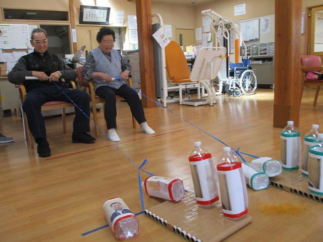 デイサービスセンターくろさわでは、様々なゲームを行っており、最近では『いかだゲーム』を行いました。職員の顔写真を貼ったペットボトルを、いかだから出来るだけ落とさないように紐を巻き取り、より多くのペットボトルを残して先にゴールした方が勝ち。いかだを引くために手元の芯を巻き取るので運動にもなります。赤・白チームの対抗戦で行ったので、ご利用者様もたいへん盛り上がりました。