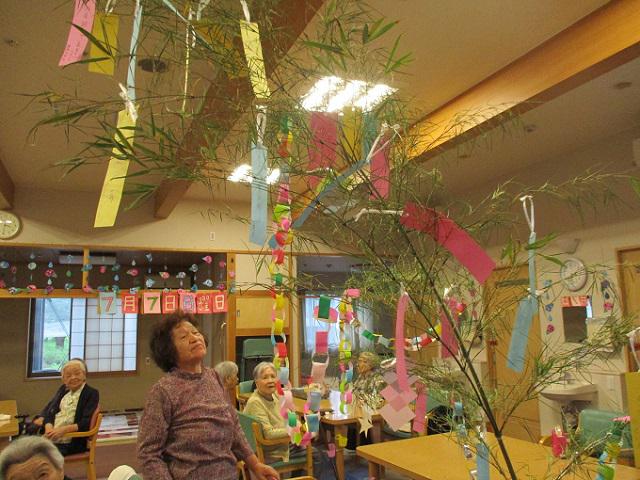 「家庭円満」「健康第一」「毎日笑って過ごせます様に」「腰がまっすぐになりますように」沢山の願いを込めて皆さんで作った飾りと共に笹の葉に結び、七夕を楽しく過ごしました。
