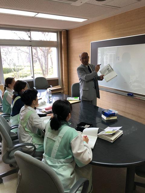 技能実習生は、日本での実習に入る前に日本語検定4級に合格しており、仕事をしながら日本語検定3級に合格する必要があります。友愛会に勤務している4名の技能実習生も3級の検定合格に向け、勤務時間外に先生に教わりながら学習しています。