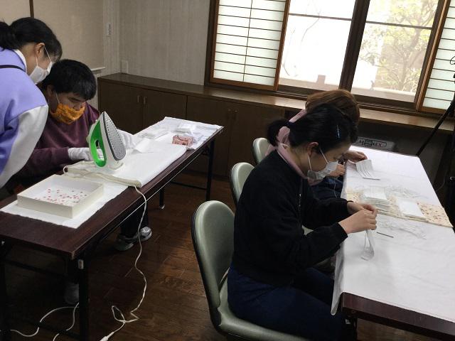 慣れない作業で、はじめは思うように作業が進みませんでしたが、感染拡大防止と皆様の安心のため、頑張って作業を行っております。現在、300枚以上のマスクが完成しました。