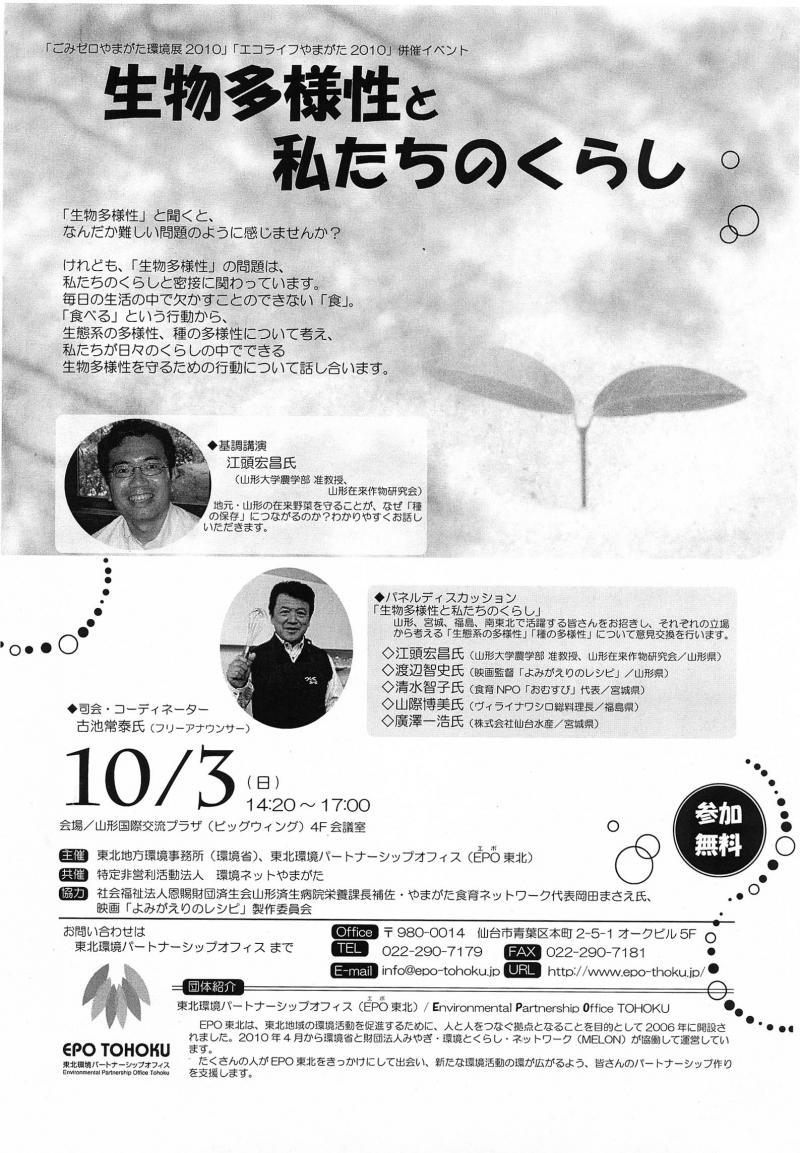 10月に名古屋でCOP10が開催されるのに連動して、山形でも生物多様性関連の催しが開催されます。
