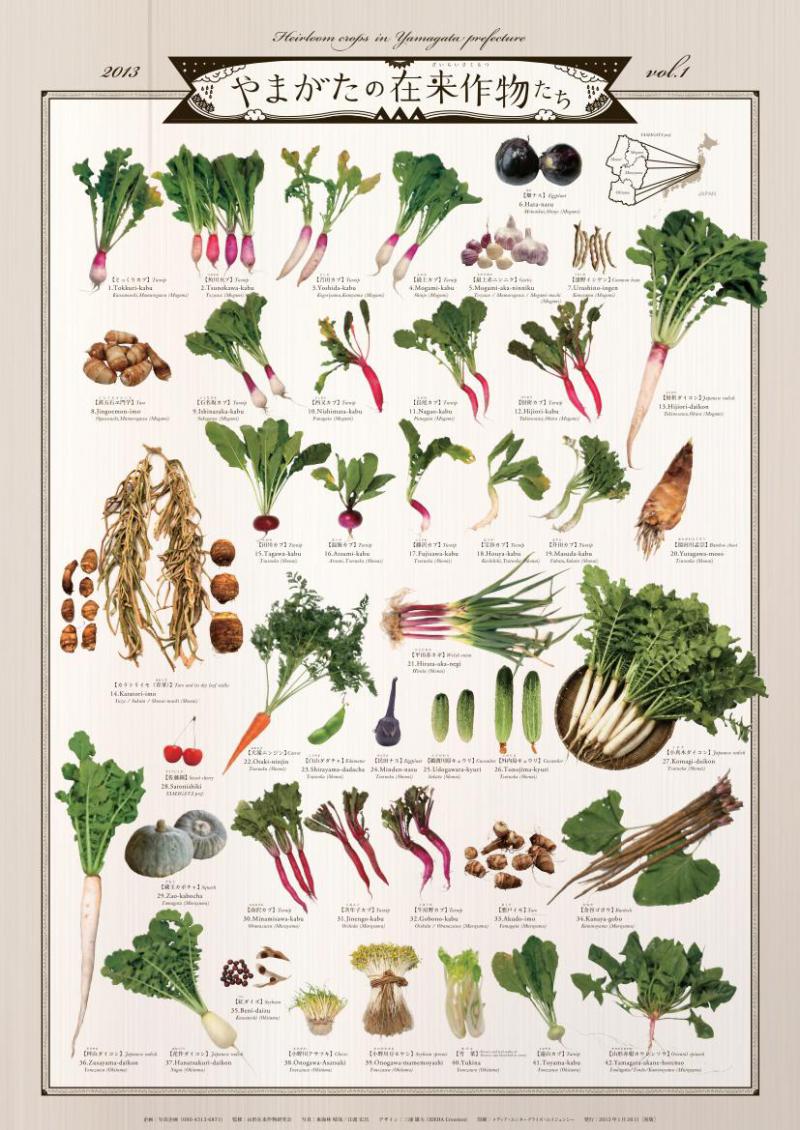 山形県の4地方全域の代表的な根菜類を中心に、東海林さんが撮りためた選りすぐりの42種類の在来作物の写真を投入し、自分が飾っておきたくなるものに仕上げたいと紙の質感にもこだわったそうです。また在来作物の一つ一つに、小学生にも読めるように漢字とふりがなの名前をつけ、外国人にも読めるようにローマ字と英語名の名前も併記しています。