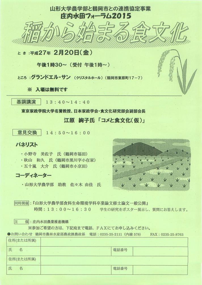 急なお知らせで恐縮ですが、あす2月20日(金)13:30より山形県鶴岡市のグランドエル・サンにて「稲から始まる食文化」と題する集いがあります。基調講演は食文化研究の第一人者の江原絢子先生、パネルディスカッションおよび同会場で、山形大学農学部安全農産物生産学コースの学生の卒・修論のポスター発表もあります。関心のある方はどうぞおこし下さい。入場は無料ですが、参加申し込みが必要です。詳しくはチラシをごらん下さい。