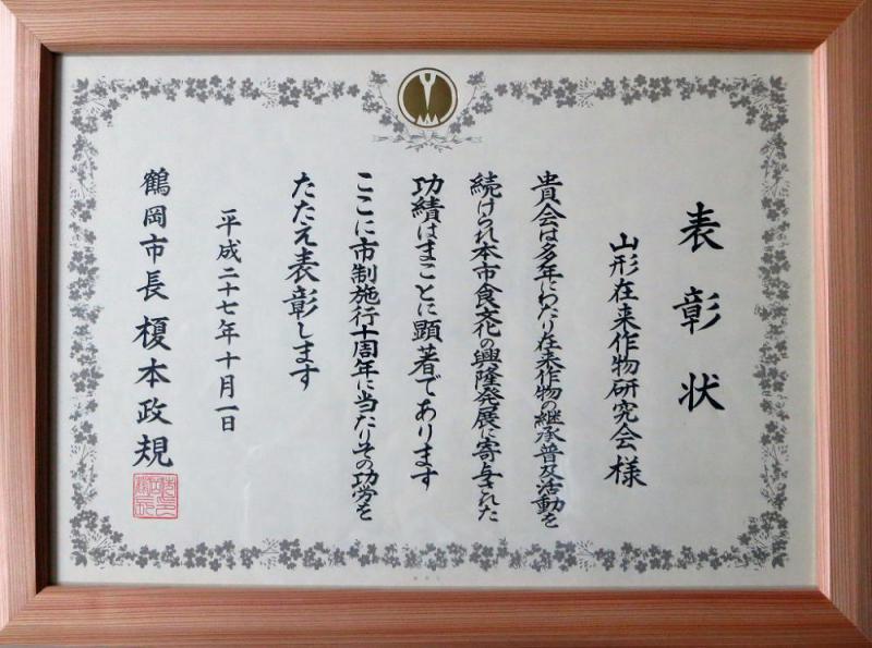 平成27年10月1日、鶴岡市市制施行10周年記念式典が鶴岡市内で行われ、山形在来作物研究会が教育・文化功労部門で特別表彰されました。
