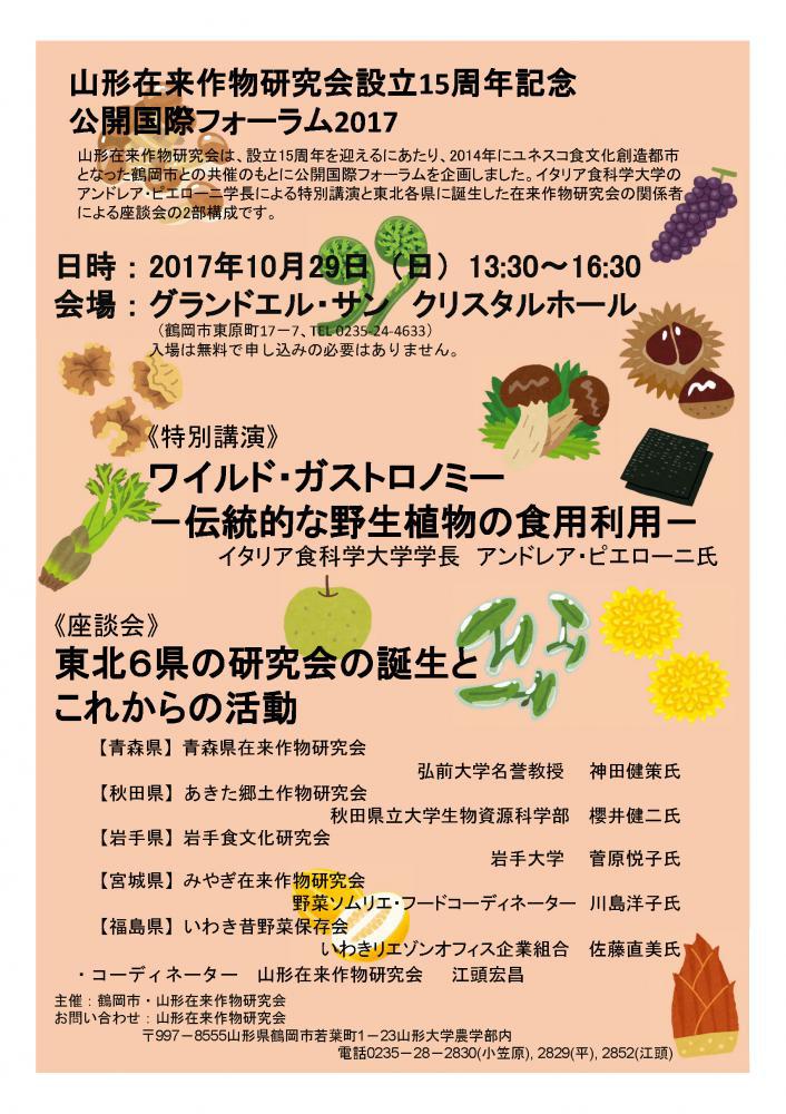 山形在来作物研究会は、設立15周年を迎えるにあたり、2014年にユネスコ食文化創造都市となった鶴岡市との共催のもとに公開国際フォーラムを企画しました。イタリア食科学大学のアンドレア・ピエローニ学長による特別講演と東北各県に誕生した在来作物研究会の関係者による座談会の2部構成です。