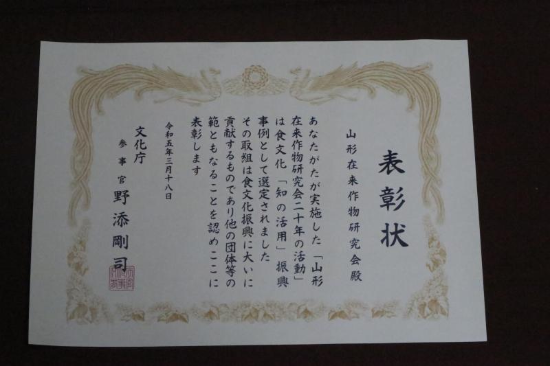 2023年3月18日、食文化に関する学術的な研究と食文化に関する現場が緊密に連携し、食文化の振興に向けた取組みを全国から募集し、優れた事例の一つとして山形在来作物研究会の過去20年の活動が文化庁から表彰されました。