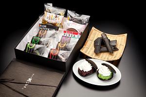 「ほんてん黒いどら」は方言で「ほんとうに黒いですね」という意味。食用竹炭とココアを生地に混ぜてフワフワに焼いています。普通では満足できないアナタに!