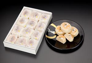 香り豊かな柚白餡に茶葉をのせ、軽く焼き、砂糖衣で仕上げた小さめの上品なお菓子です。大正2年創業時の初代の思いが、現在の四代目にも引き継がれています。
